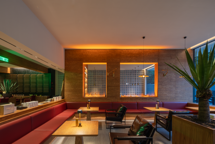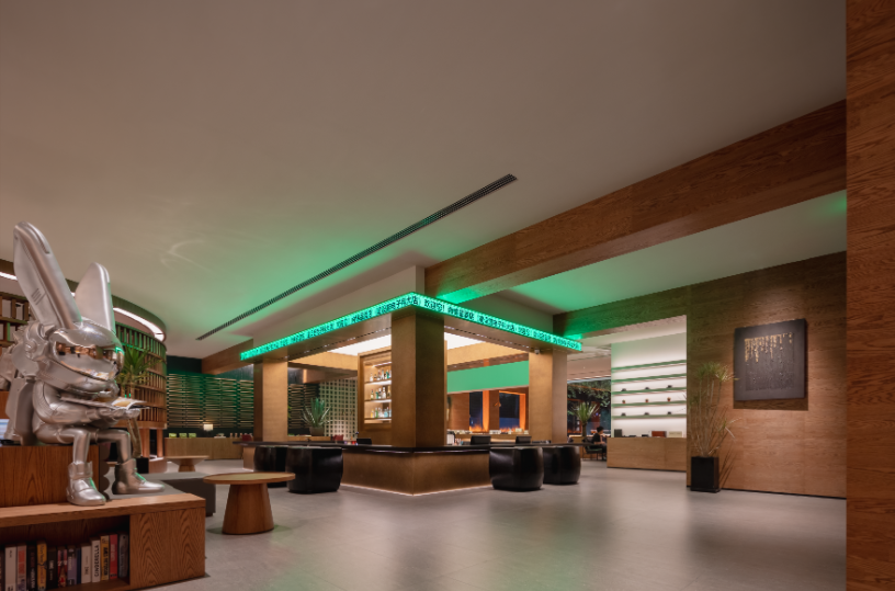 尚錦品酒店采用新空間、新體驗(yàn)設(shè)計(jì)理念的打造一個中庭島嶼式下沉前臺,一個沉侵式咖啡吧里的前廳,酒店賓客的會客廳,既實(shí)現(xiàn)了接待功能,又滿足了賓客在旅居中。通過閱讀、咖啡、酒吧、慵懶休閑的沙發(fā)等元素的應(yīng)用,營造旅居的松弛感,入住酒店可體驗(yàn)成都時尚現(xiàn)代的慢生活方式。